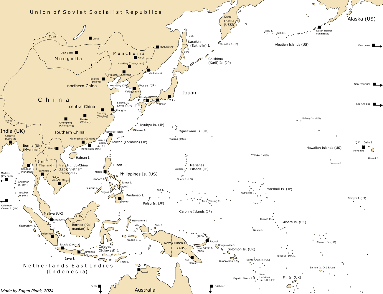 I made this general map for easier orientation in the large Asia-Pacific area, filled with various place names. Place names mentioned here are not the most important, but most relevant to the history of the Sino-Japanese War and the World War 2 at the Pacific.